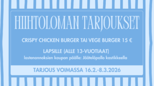 Plevnassa kaikkina hiihtoloma viikkoina (vko 8, 9, 10) tarjouksessa: CRISPY CHICKEN BURGER L, (G) 15,00 €Briossisämpylän välissä rapeaa broilerin sisäfilettä, aiolia, tomaattia ja salaattia. Annos sisältää aiolidipin ja maalaisranskalaiset. (Saatavana myös gluteenittomalla sämpylällä.) VEGEBURGER L, M, VEG (G) 15,00 €Briossisämpylän välissä vegaaninen burgerpihvi (HP), aiolia, tomaattia ja salaattia. Annos sisältää aiolidipin ja maalaisranskalaiset. (Saatavana myös