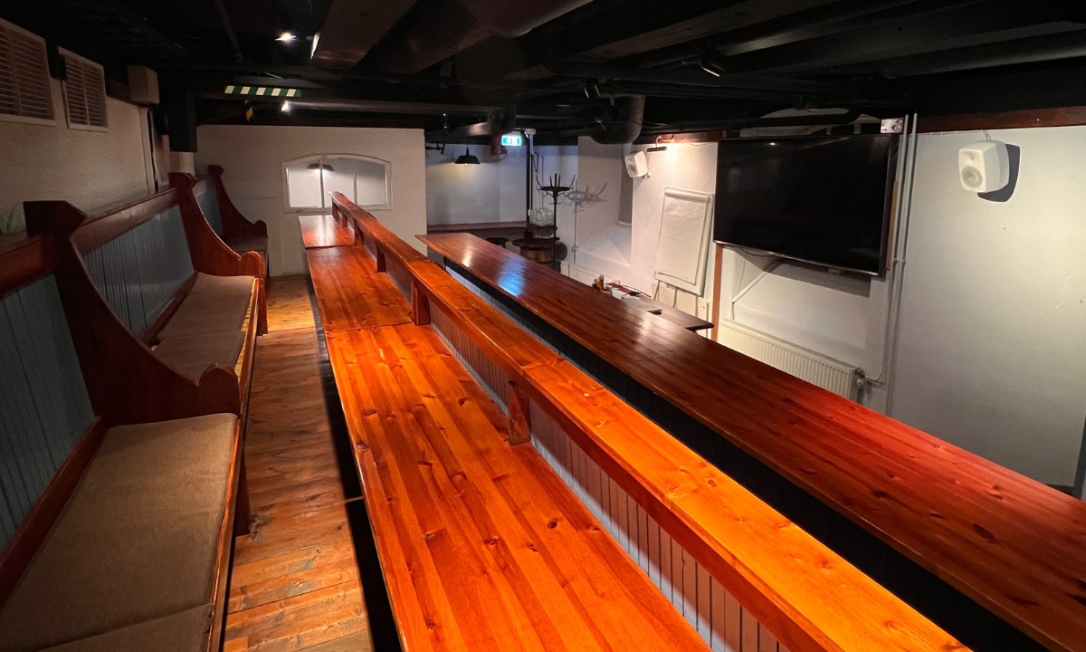 Esiintymislavan vieressä sijaitseviin Patruunan pöytiin mahtuu useampikin seurue.