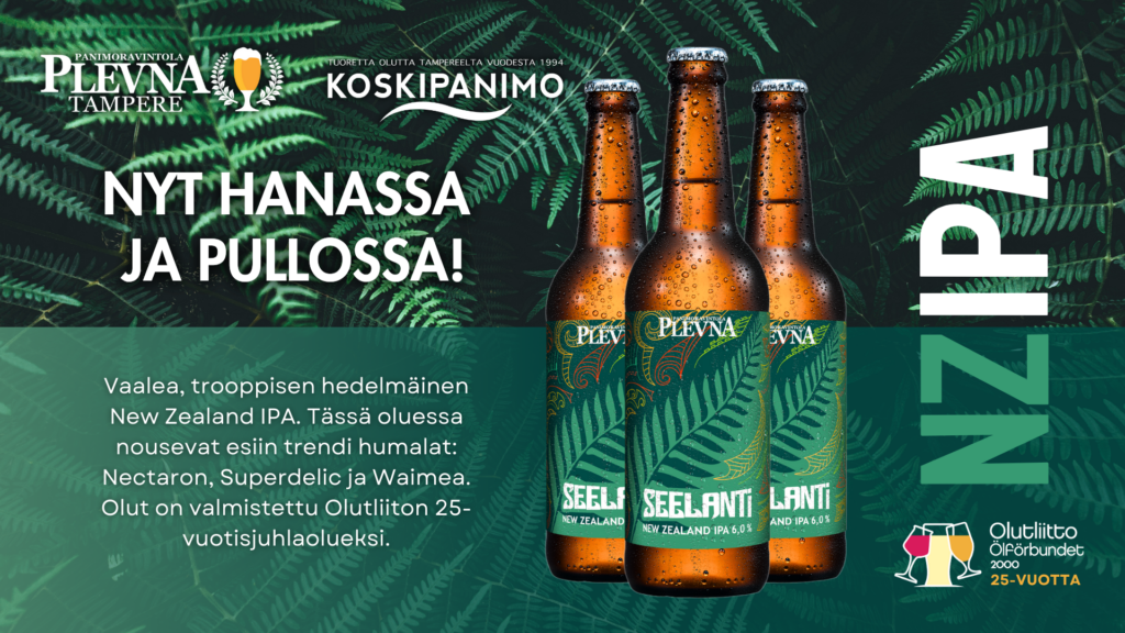 Vaalea, trooppisen hedelmäinen New Zealand IPA. Tässä oluessa nousevat esiin trendi humalat: Nectaron, Superdelic ja Waimea. Olut on valmistettu Olutliiton 25-vuotisjuhlaolueksi. Nyt hanassa ja pullossa! Seelanti-sarjan 1. olut.
