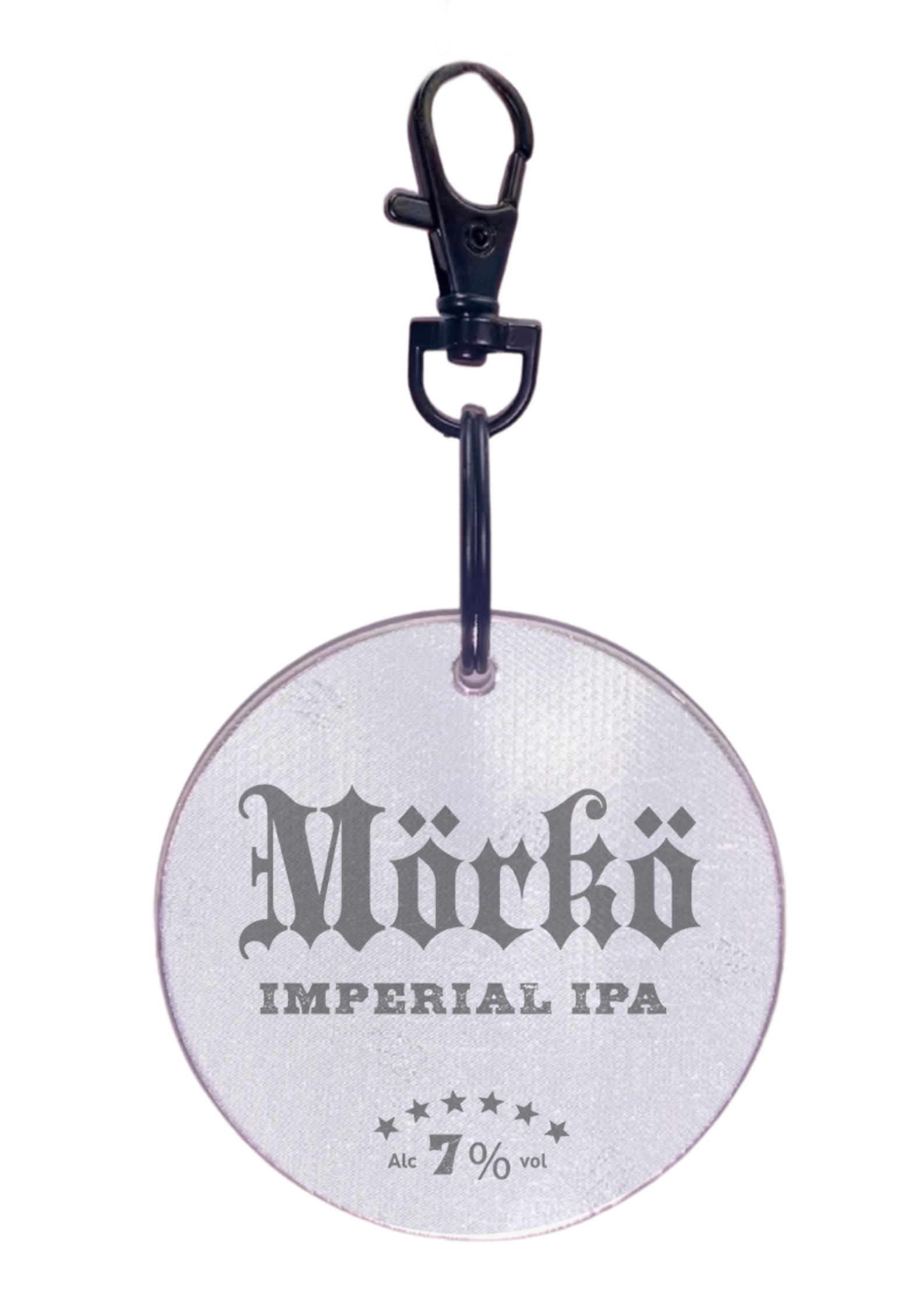 Tämä heijastin mulkoilee liikenteessä puolestasi – toinen puoli näyttää Mörön tuiman katseen ja toisella puolella komeilee Mörkö Imperial IPA -logo. Nappaa kiinni reppuun, takkiin tai avaimiin, niin Mörkö pitää huolta näkyvyydestäsi.