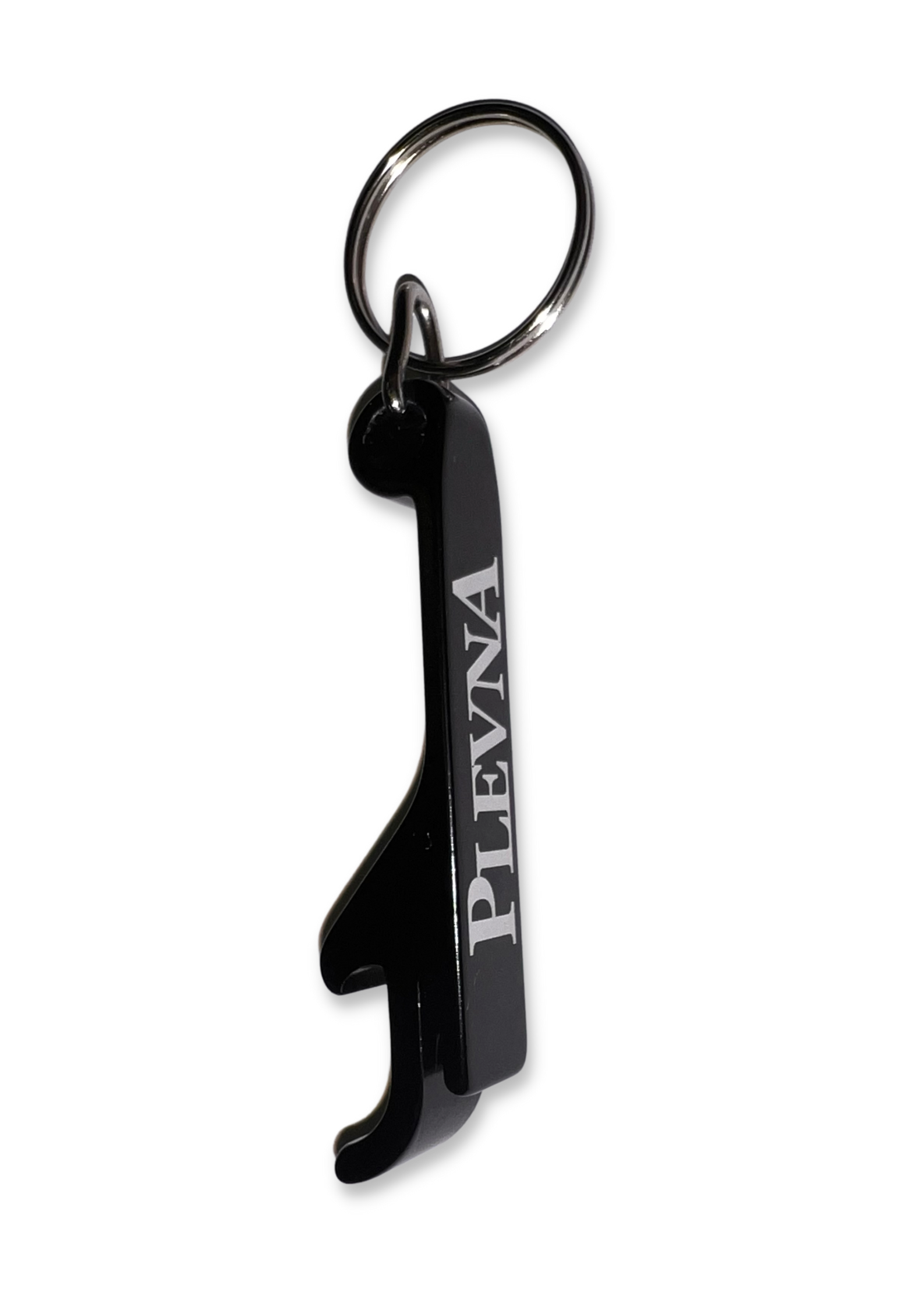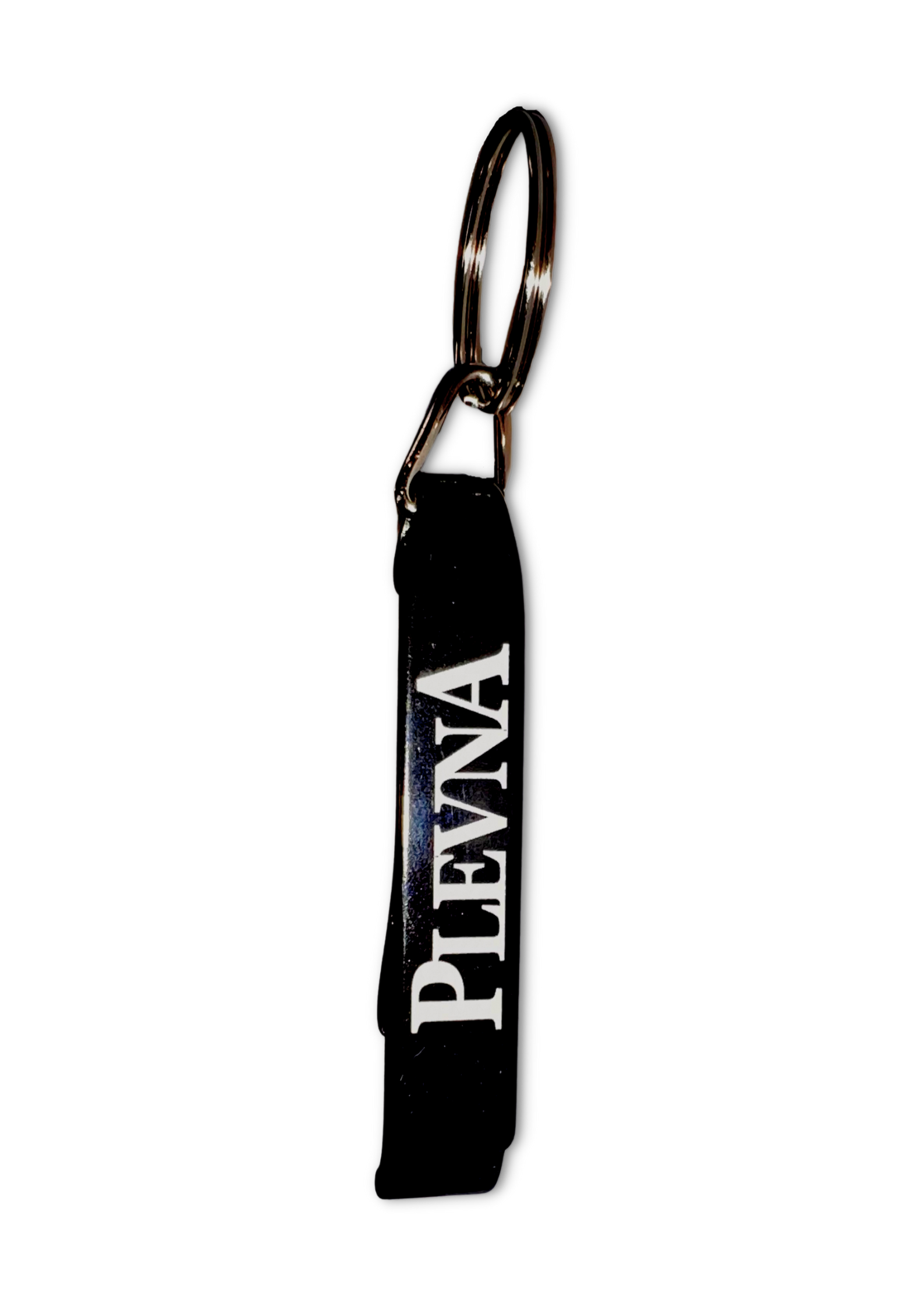 Tyylikäs pullonavaaja-avaimenperä varustettuna Plevnan logolla.